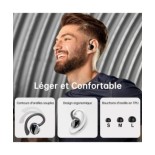 Les crochets d'oreille souples s'adaptent parfaitement à la forme de vos oreilles, garantissant confort et maintien sécurisé lors des activités physiques intenses. Trois tailles différentes de bouchons d'oreille sont incluses pour un ajustement personnalisé. Avec un indice d'étanchéité IP7, ces écouteurs résistent à la sueur et à la pluie, idéaux pour le sport, les entraînements ou la course à pied.